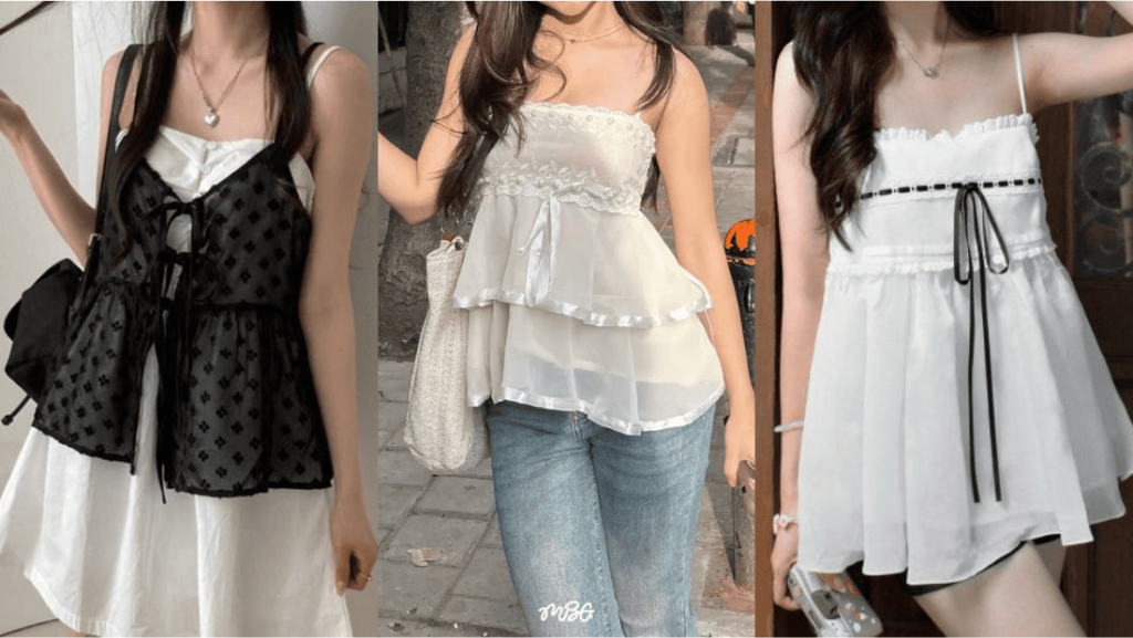 เดินผ่าน Gen Z ต้องเจอคนแต่งตัวลุคนี้อย่างแน่นอน เสื้อผ้าแนวเลเยอร์ที่ทำด้วยผ้าโปร่ง ผ้าชิพฟ่อน พร้อมตกแต่งด้วยลูกไม้ ไม่ว่าจะเป็นการปักลายดอกเล็ก ๆ ลงบนผ้าบาง หรือการแต่งขอบเสื้อสายเดี่ยวที่ซ้อนกันเป็นเลเยอร์ด้วยลูกไม้และโบว์ผ้าซาติน ทั้งหมดนี้ล้วนส่งให้คุณกลายเป็นคุณหนูที่มีความหวานปนซนน่าค้นหาอย่างยิ่ง